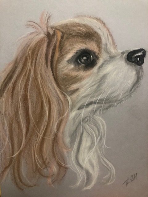 Kingcharlesinspanieli taulu. Mustesuihkukirjoittimella tulostettu kuva (pastellivärityöstä kopio) valokuvapaperille. Koko A4. Kehykset MDF-levyä, pleksilasi. Seinäkoukku ja jalkatuki. Kuvitus: Tanja Lehtinen.