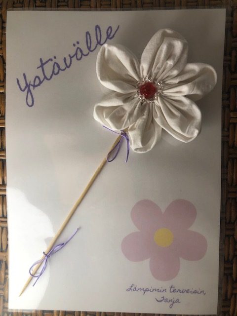 Käsityönä valmistettu kangaskukkakortti. Kierrätyskankaasta valmistettu kukka. Korttipohja valinnaisella tekstillä. Korttipohjan koko: A4.